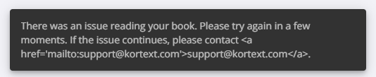 We are currently experiencing some issues with loading titles on the Kortext web browser. You may see the following error message when trying to read a book on screen: